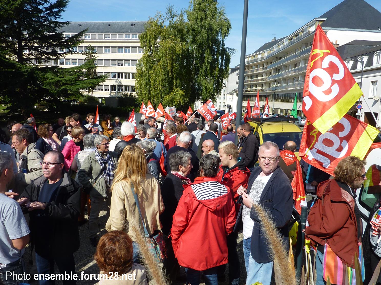 La mi-septembre à peine dépassée et c’était déjà la deuxième journée d’action contre la mise en place de la destruction du code du travail par ordonnances ! En Eure-et-Loir, la CGT, FO et la FSU avaient choisi un rassemblement devant les fenêtres de la représentante de l’État à midi. C’est au moins 300 salariés et retraités qui se sont retrouvés avec force drapeaux parmi lesquels ceux de la FSU et de Solidaire avaient pris du nombre depuis le 12 septembre.