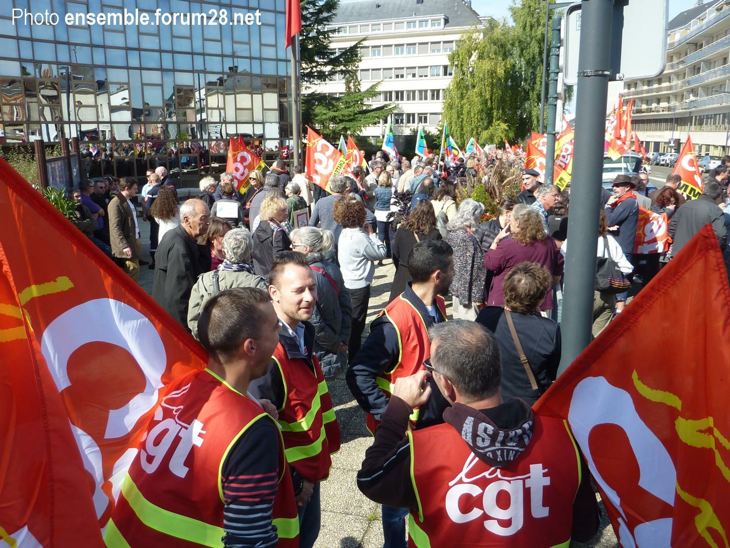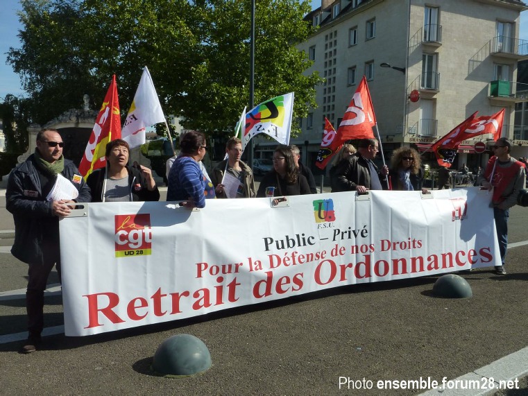 Et si la banderole de FO-28 était à nouveau présente, un calicot intersyndical, tout beau, tout neuf, a fait son apparition (photo ci-contre) dénotant que, pour les fédérations départementales, la lutte n’en est qu’à son début. Quelques pancartes ont éclos dont une du collectif eurélien contre les traités de libres-échanges affirmant : « CETA UE-Canada = concurrence sociale par le bas ». L’offensive libérale est effectivement tous azimuts.