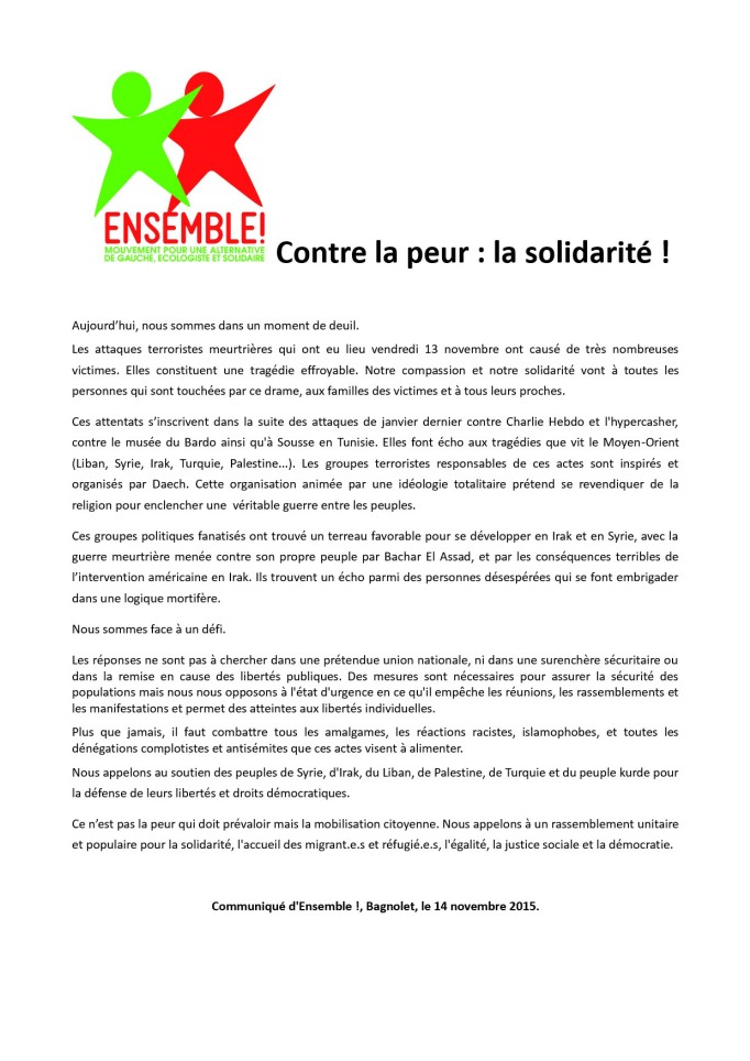 Les positions exprimées dans les communiqués accessibles par les liens ci-dessous n'engagent que les organisations qui les signent mais ni Ensemble! ni le site ensemble.forum28.net